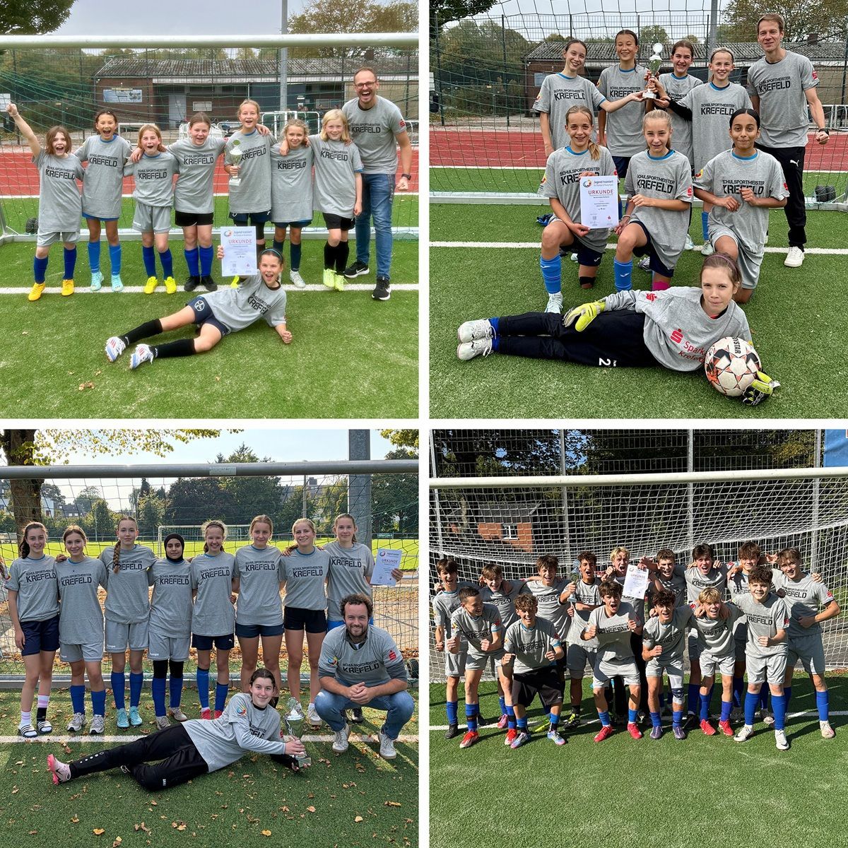 - Die Mädchen (5a) retteten sich nach einer sehr schwierigen Vorrundengruppe gerade noch als Gruppendritte in die Endrunde. Mit einer beeindruckenden Leistungssteigerung siegten sie im Achtel- und Viertelfinale locker. Im Halbfinale kam es zur Revanche gegen einen Vorrundengegner – und diesmal behielten unsere Mädels die Nerven und siegten. Erst im Finale gegen die Liebfrauenschule aus Grefrath war Endstation. Ein hervorragender 2. Platz ist der Lohn für diesen tollen Turniertag!